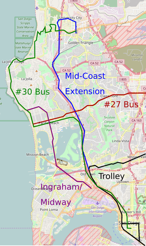 In the presence of rail, the strong routes are the ones orthogonal to the rail line. Here, the 27 and 30 already preexist; there is a planned Trolley stop at the intersection with the 27, and presumably the 30 will be rerouted to serve that intersection rather than to duplicate the trains along the freeway. (I tried talking to the transit agency about this, but didn’t get any useful answers.) So the decent east-west bus ridership in Pacific Beach is actually an argument in favor of a north-south rail extension.