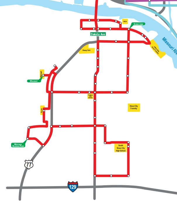 Here is a PDF map of the entire network. It has 10 routes, using 12 buses running hourly, with a timed meet at the center of Sioux City (just off the above map) at :30 every hour. Most routes run as loops, with highly separated inbound and outbound legs. Route 9 above runs one-way southbound on Dakota Avenue in the northern and southern legs but then meanders to run southbound on Route 77; the Dakota Avenue leg in between the two major east-west runs is one-way northbound.