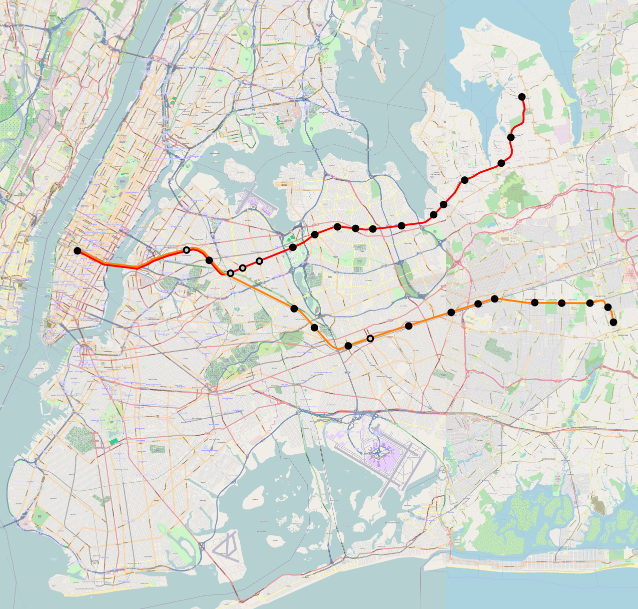 The map includes only the lines that should be part of a Manhattan-bound rapid transit system initially. This excludes the South Shore LIRR lines, not because they’re unimportant (to the contrary), but because connecting them to Manhattan involves new flying junctions at Jamaica Station, built as part of East Side Access without any real concern for coherent service. Shoehorning these lines into the system is still possible (indeed, it is required until ESA opens and probably also until some Brooklyn-Lower Manhattan LIRR tunnel might open), but the scheduling gets more complex. These lines should be a further phase of this system, whereas I am depicting an initial operation.