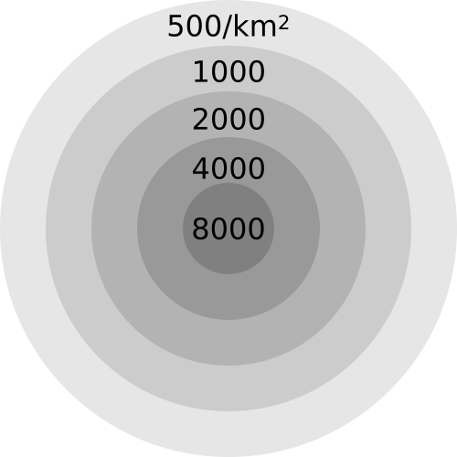 Let us assume that the amount of v-km per inhabitant within each concentric circle is proportional to the outer radius of the circle, so people in the outermost ring drive 5 times as long as those in the inner circle. For concrete numbers, let us assume these figures are 5,000, 10,000, 15,000, 20,000, and 25,000 v-km per year; they average about 13,550 v-km/capita, which is somewhat less than the US average, just below 16,000 per FRED. Note that the outermost ring has 10.8% of the city’s population and 20% of its v-km.