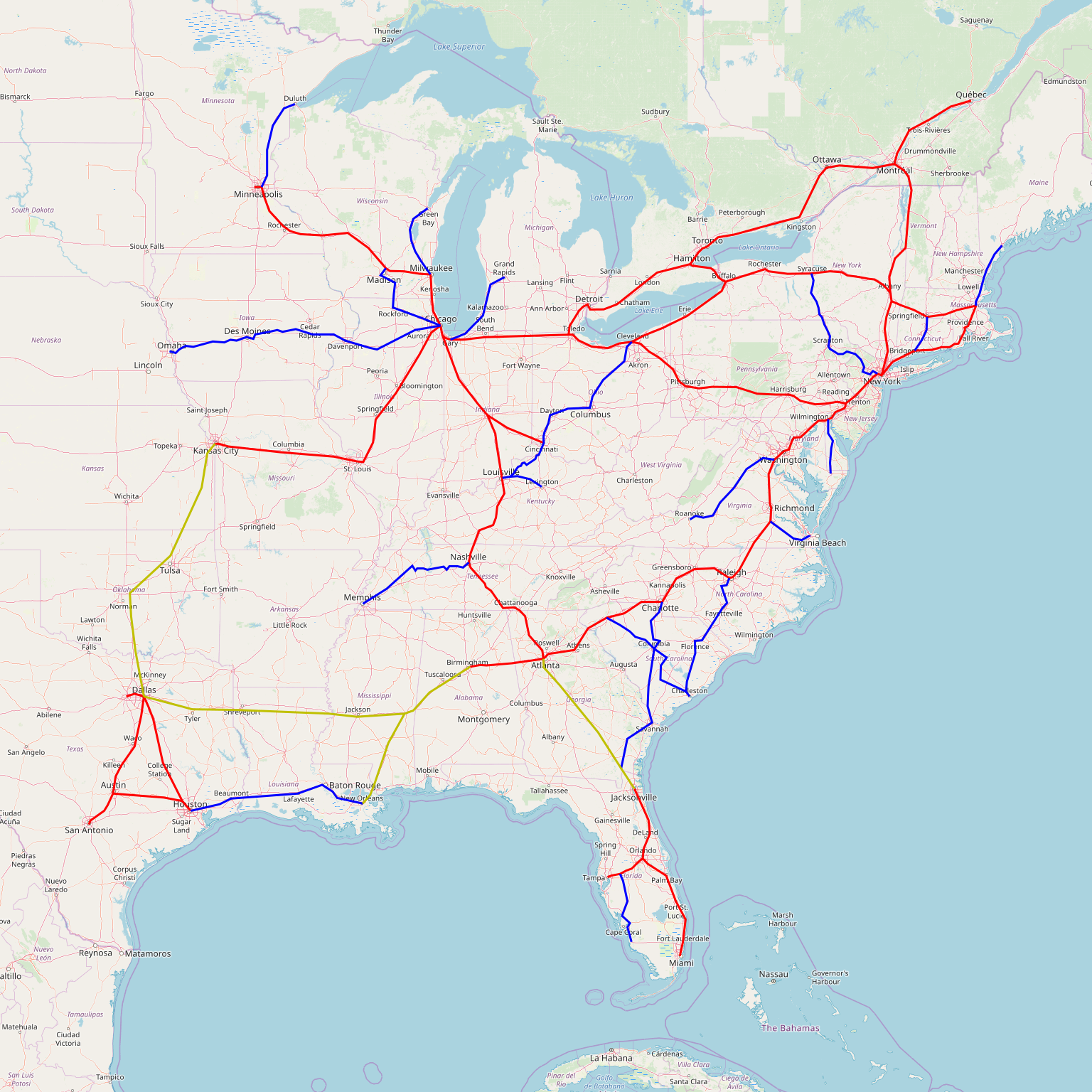 This is not meant to be an exhaustive list. Some of the alignments may not be optimal, and one of the red lines, Albany-Montreal, can plausibly be reclassified as yellow due to the weakness of travel markets from the United States to Montreal.