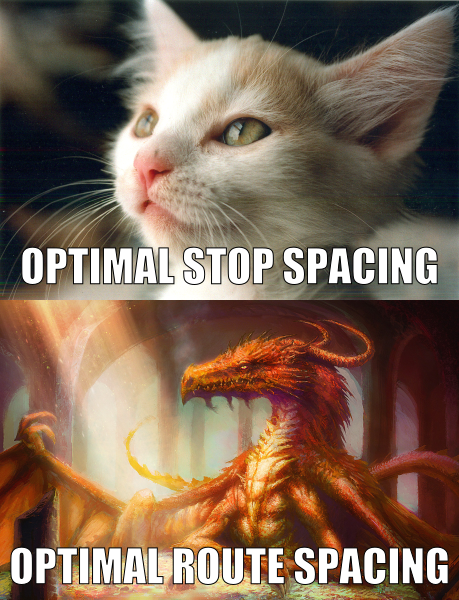 Second, the model assumes the same penalty w for walking and waiting, but sometimes these two activities have distinct penalties, and then the walk penalty is responsible for the occurrence of w in the numerator in the formula whereas the wait penalty supplies the appearance of w in the denominator. Improving bus stop facilities reduces the wait penalty, pushing the optimal s farther down, even though at the same time it’s cheaper to improve bus stops if there are fewer of them.