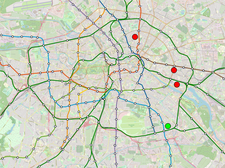 My trips to the two southern red dots, both gaming events, are not too onerous, using the Ringbahn. But my trip to the northern red dot isn’t so easy; besides being circuitous, the Ringbahn is currently shut down for maintenance for a segment in between. Now, there’s redundancy, I can still get there, but it requires a three-seat ride involving U7, U8, and U2, and what’s more, the U8/U2 transfer at Alexanderplatz is long.