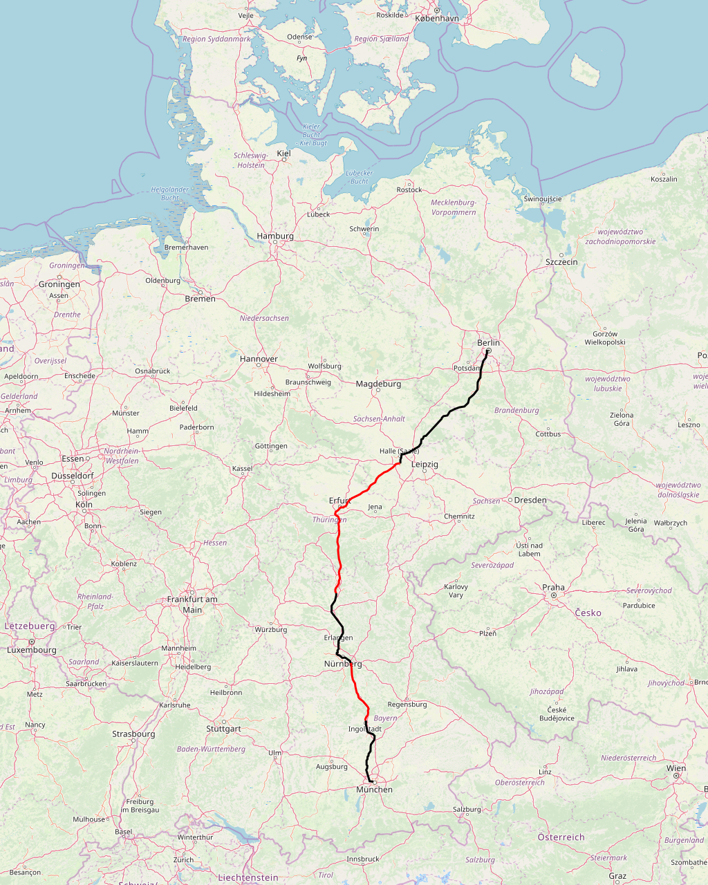 I’m uncertain about the exact travel time benefits of such a high-speed line. I put a route through my train performance calculator and got about 2.5 hours with intermediate stops at Südkreuz, Erfurt, Nuremberg, and possibly Ingolstadt (skipping Ingolstadt saves 3 minutes plus the dwell time), using the performance characteristics of the next-generation Velaro. But I’m worried that my speed zones are too aggressive and that the schedule should perhaps accommodate TGVs coming from Paris via Frankfurt, so I won’t commit to 2:30; however, 2:45-2:50 should be doable, even with some unforeseen political compromises.