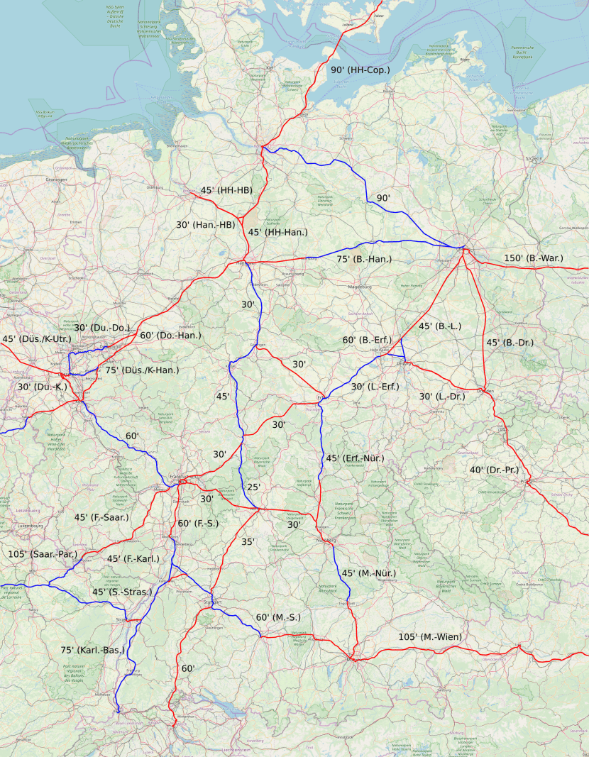 Blue indicates lines that already exist or are under-construction, the latter category including Stuttgart-Ulm and Karlsruhe-Basel. Red indicates lines that are not; some are officially proposed, like Frankfurt-Mannheim and the Hanover-Hamburg-Bremen Y, others are not but should be.