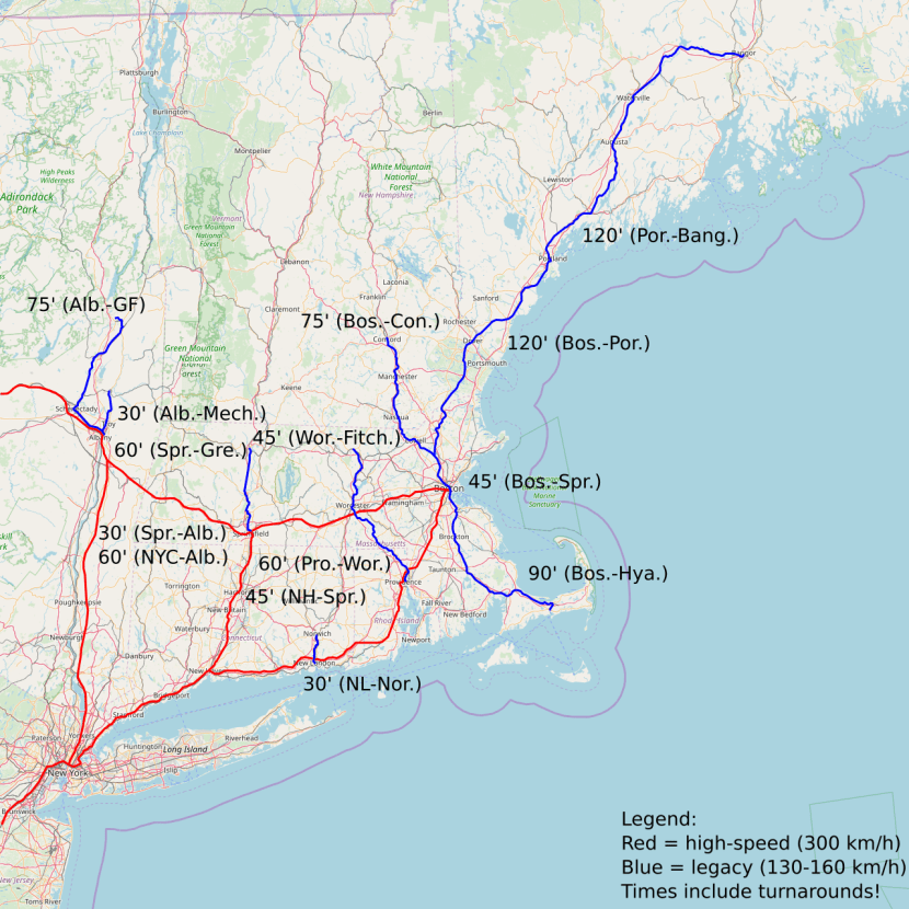 The red high-speed lines are flashy, but the blue ones are important too. That’s the key takeaway from planning in Switzerland, Austria, and the Netherlands, all of which have high rail usage without great geography for intercity rail. Trains should be planned coherently as a network, with all parts designed in tandem to maximize connectivity. This isn’t just about going between Boston and Springfield or Boston and Albany or New Haven and Springfield, but also the long tail of weaker markets using timed connections, like New Haven-Amherst, Brockton-Worcester, Dover-Providence, Stamford-Mohegan Sun, and so on. A robust rail network based on ITT design principles could make all of these and many more connections at reasonable cost and speed.