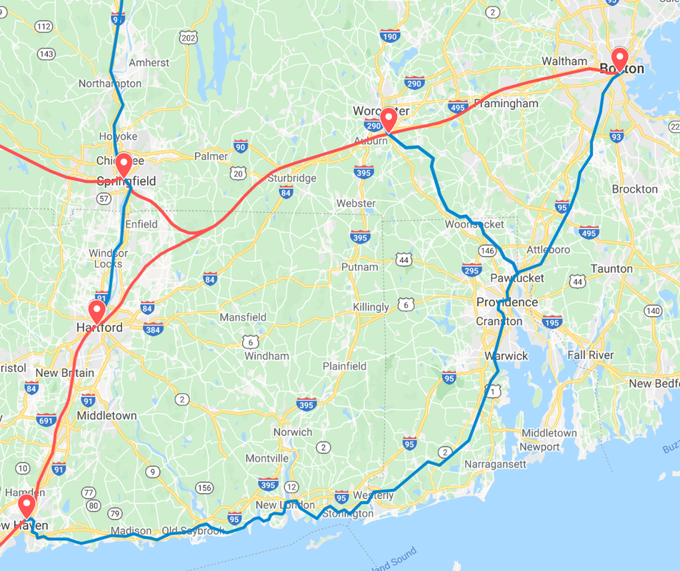 What is the value of having true HSR up the Connecticut Valley and along the coast through Rhode Island? Routing 330km/h HSR from New York through New Haven, Hartford, and Worcester serves basically every population center of interest in New England except Providence and Springfield, each of which can be accessed by a quick transfer to electrified conventional rail at New Haven for Providence or Hartford for Springfield. It just doesn’t seem worthwhile to me to spend billions more to essentially just bring HSR to New London and Providence.