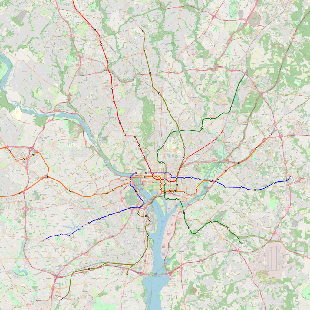 A full-size version can be found here; note that the lines at Union Station are moved around to get rid of the Red Line’s awkward U-shape. The northeast extension option is colored red but should be a Blue Line extension, but the Red Line taking over H Street and going to Largo.