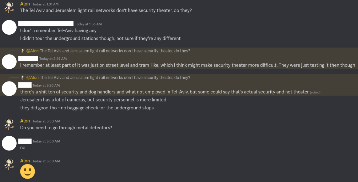 For this, I naturally went to the country facing terrorism and violence that I know most intimately. I haven’t visited in more than 11 years, and so I’ve never taken the light rail in either Tel Aviv or Jerusalem (which was open on my last visit but I didn’t visit the city then). So I went ahead and asked on my Discord server, and got this: