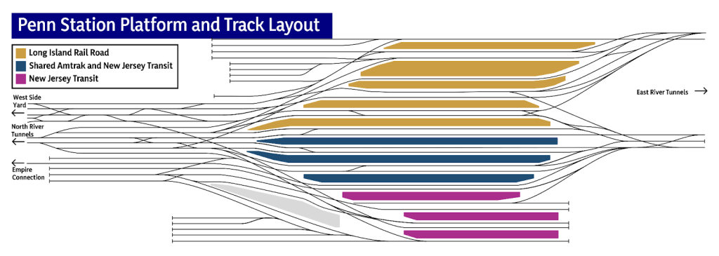 Under current plans, there is little interaction between the LIRR and the Northeast Corridor. There are two separate routes into Penn Station from the east, one via 32nd Street (“southern tunnels”) and one via 33rd (“northern tunnels”), each a two-track line with one track in each direction. The North River Tunnels, connecting Penn Station with New Jersey and the rest of the United States, face the southern tunnels; the Gateway tunnels under construction to double trans-Hudson capacity are not planned to pair with the northern tunnels, but rather to connect to stub-end tracks facing 31st Street. For this reason, Amtrak always or almost always enters Penn Station from the east using the southern tunnels; the northern tunnels do have some station tracks that connect to them and still allow through-service to the west, but the moves through the station interlocking are more complex and more constrained.