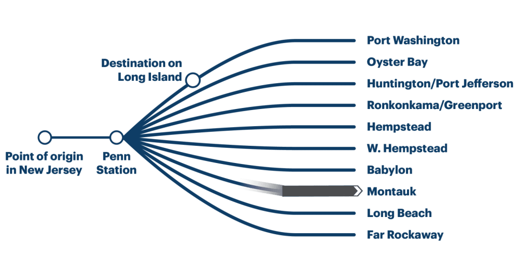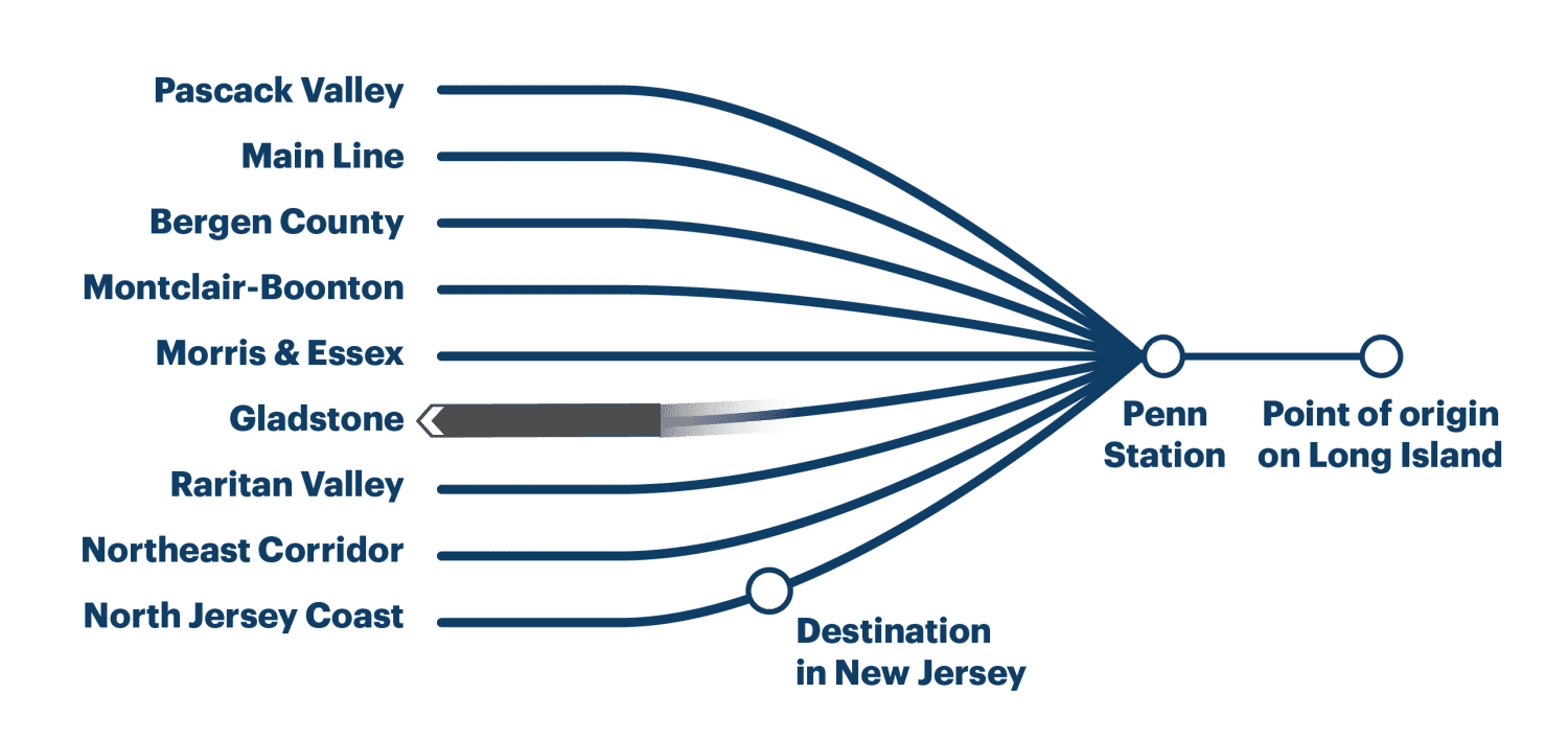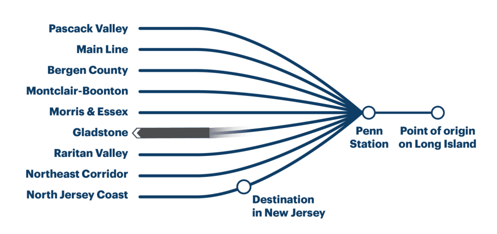 In truth, even setting aside a Penn-Grand Central tunnel (which is doable at MTA construction costs at a lower cost than Penn expansion), the destination in New Jersey is likely to be not just on the North Jersey Coast Line as depicted, but on any of the Northeast Corridor, North Jersey Coast, and Raritan Valley Lines. At present, the first two carry 14 trains per hour at the peak, and are decently likely to be one’s pair east of the Hudson. Similarly, one’s destination east of Penn Station is unlikely to be Long Island as commonly defined to exclude Brooklyn and Queens but rather to be on the trunk in Long Island City or on multiple branches within the city or perhaps on the New Haven Line.