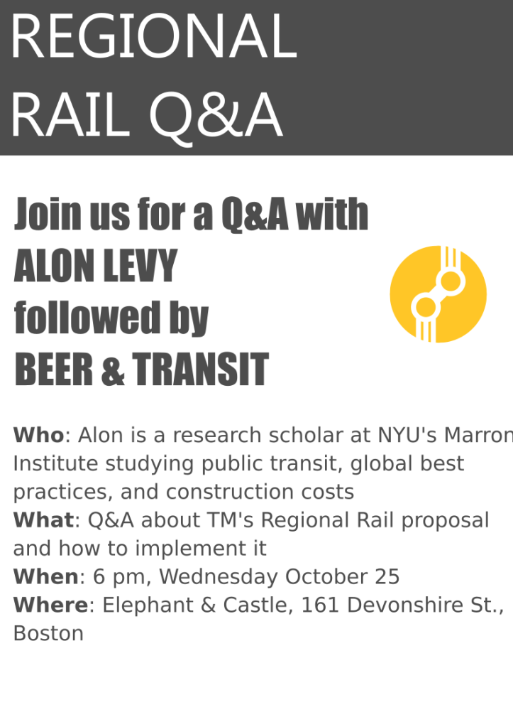 I’m in Boston this week (and in New York next week), meeting with friends and TransitMatters people; in particular, I’m giving a talk at the Elephant and Castle on Wednesday at 6 pm to discuss regional rail and related reforms for Boston: