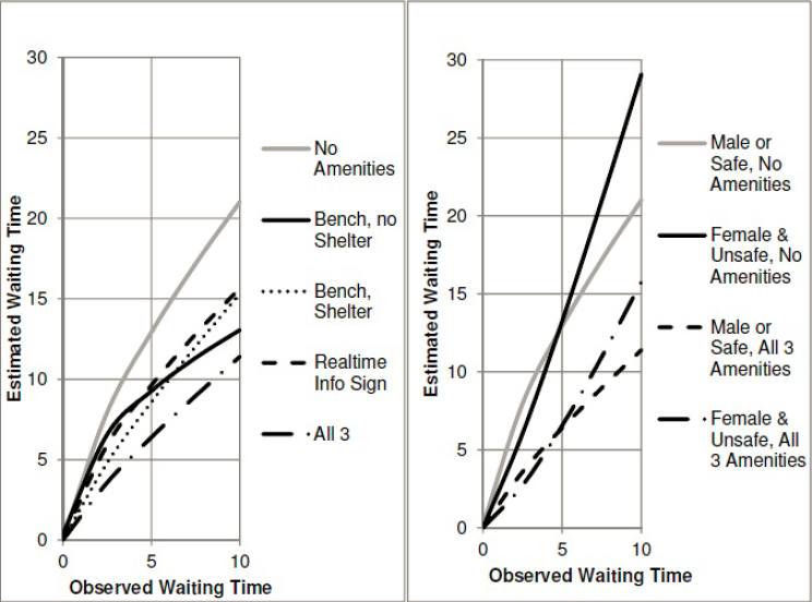 If the wait is 5 minutes then the impact is similar. With bench and shelter the perceived wait is 8.5 minutes, equivalent to a 3-minute wait without any amenities; with real-time information, the perceived wait is 6.5 minutes, equivalent to a 2-minute wait without amenities. There is some scale-dependence, but not too much, so we can model the impact of shelter as equivalent to that of increasing frequency from every 10 minutes to every 6.5 minutes (without real-time displays) or every 4 minutes (with real-time displays).