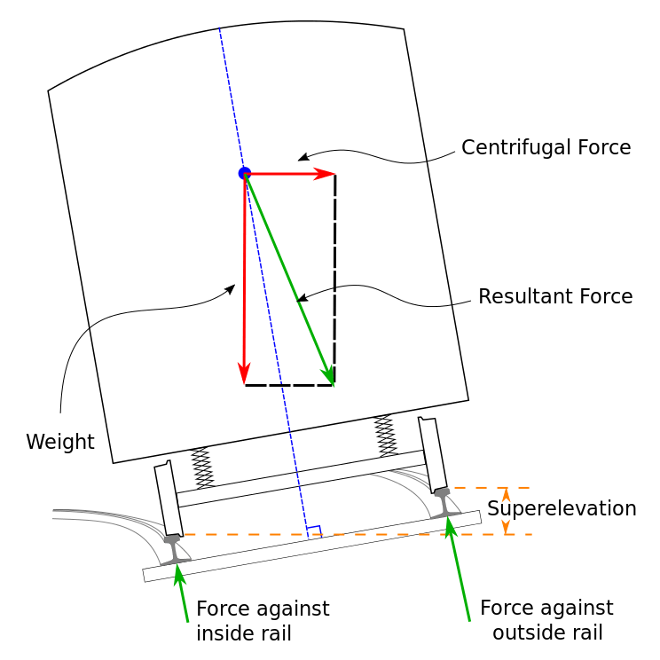 The maximum superelevation on a railway is 200 mm, but it only exists on some Shinkansen lines. More typical of high-speed rail is 160-180 mm, and on conventional rail the range is more like 130-160; moreover, if trains are expected to run at low speed, for example if the line is dominated by slow freight traffic or sometimes even if the railroad just hasn’t bothered increasing the speed limit, cant will be even lower, down to 50-80 mm on many American examples. Therefore, on passenger trains, it is always desirable to run faster, that is to combine the cant with some lateral acceleration felt by the passengers. Wikipedia has a force diagram: