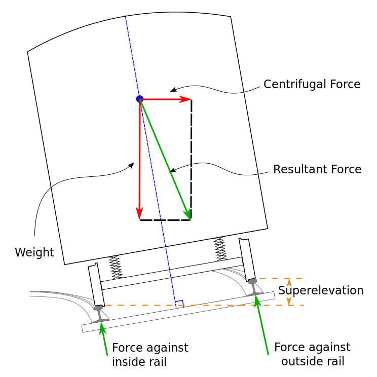 The maximum superelevation on a railway is 200 mm, but it only exists on some Shinkansen lines. More typical of high-speed rail is 160-180 mm, and on conventional rail the range is more like 130-160; moreover, if trains are expected to run at low speed, for example if the line is dominated by slow freight traffic or sometimes even if the railroad just hasn’t bothered increasing the speed limit, cant will be even lower, down to 50-80 mm on many American examples. Therefore, on passenger trains, it is always desirable to run faster, that is to combine the cant with some lateral acceleration felt by the passengers. Wikipedia has a force diagram: