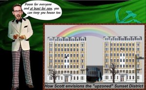 A few days later, I saw an unrelated meme, attacking Scott Wiener, the state senator representing San Francisco, who supports the YIMBY movement and introduced a zoning preemption bill that would permit mid-rise construction and abolish parking minimums near public transit. The meme consisted of two photoshops: